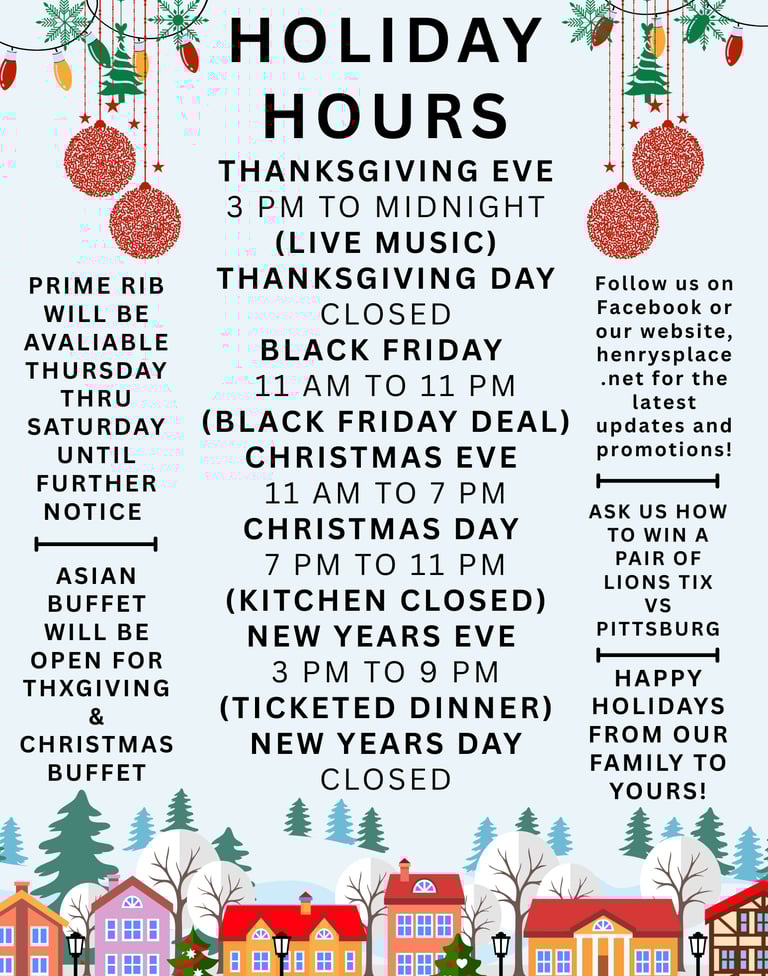 At Henry's Place, enjoy 24 beers on tap, a scratch kitchen, and a cozy ambiance perfect for dining or hosting private parties in our separate banquet room.